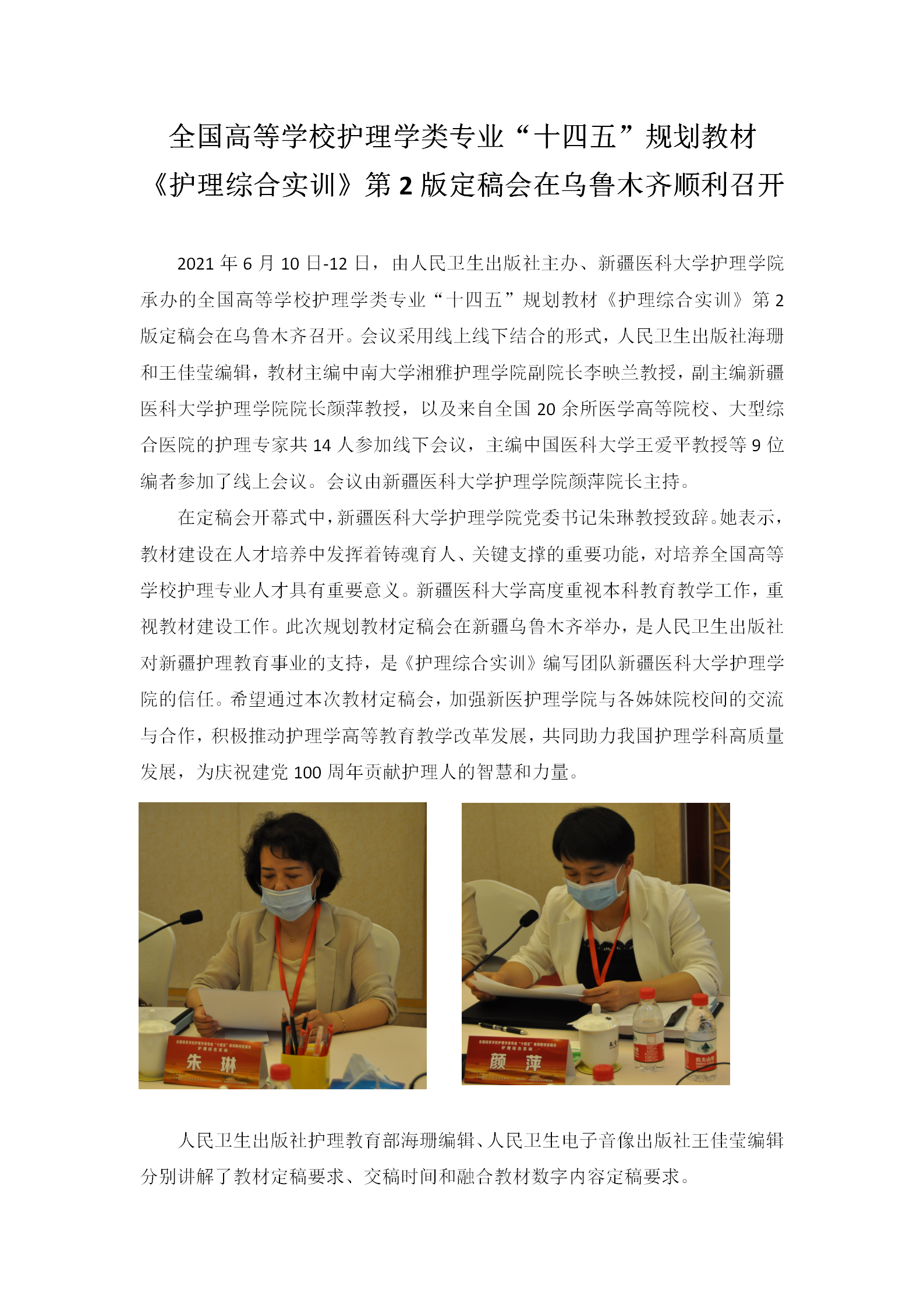 2021年6月10日-12日,由人民卫生出版社主办、新疆医科大学bat365正版唯一官网承办的全国高等学校护理学类专业“十四五”规划教材《护理综合实训》第2版定稿会在乌鲁木齐召开。会议采用线上线下结合的形式,人民卫生出版社海珊和王佳莹编辑,教材主编中南大学湘雅bat365正版唯一官网副院长李映兰教授,副主编bat365正版唯一官网院长颜萍教授,以及来自全国20余所医学高等院校、大型综合医院的护理专家共14人参加线下会议,主编中国医科大学王爱平教授等9位编者参加了线上会议。会议由新疆医科大学bat365正版唯一官网颜萍院长主持。