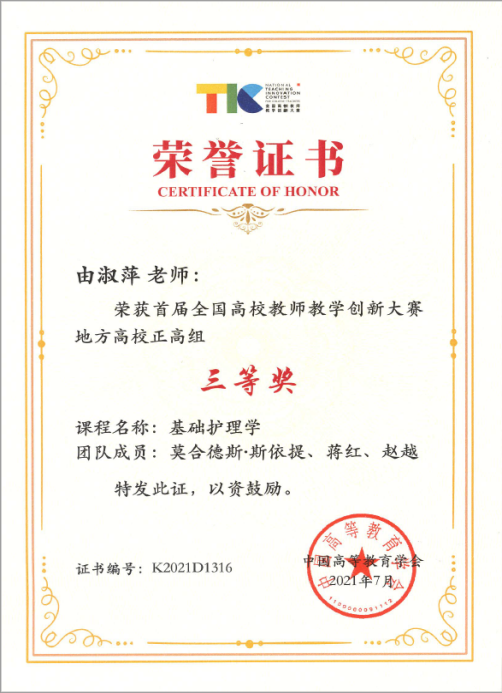 由淑萍老师讲授的《基础护理学》是护理专业的核心基础课程,,是连接基础医学课程和临床医学课程的桥梁。课程以教学内容创新为核心,以学生为中心,关注学科前沿,融入思政元素,结合课程创新实验设计等环节,全面提升了学生的实践创新能力,并实现了学术人格养成。同时,课程借助学校SPOC平台改革教学模式,开展同伴互助的教学活动,拓宽了课堂的边界,提升了学生的学习效率。