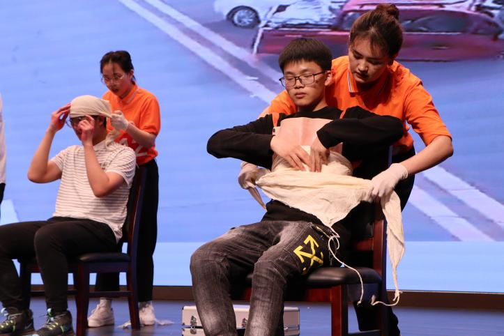大赛分为理论知识与技能操作两部分。其中理论知识内容包括基础急救知识、新冠防疫知识。技能操作环节参赛队伍从情景案例中快速分析出伤员情况,迅速分工并展开急救操作,如心肺复苏,头、胸、腹部包扎以及AED使用,人文关怀等。现场气氛紧张,扣人心弦。通过默契的配合和熟练地操作,各参赛队伍展出了新医学子急救能力。