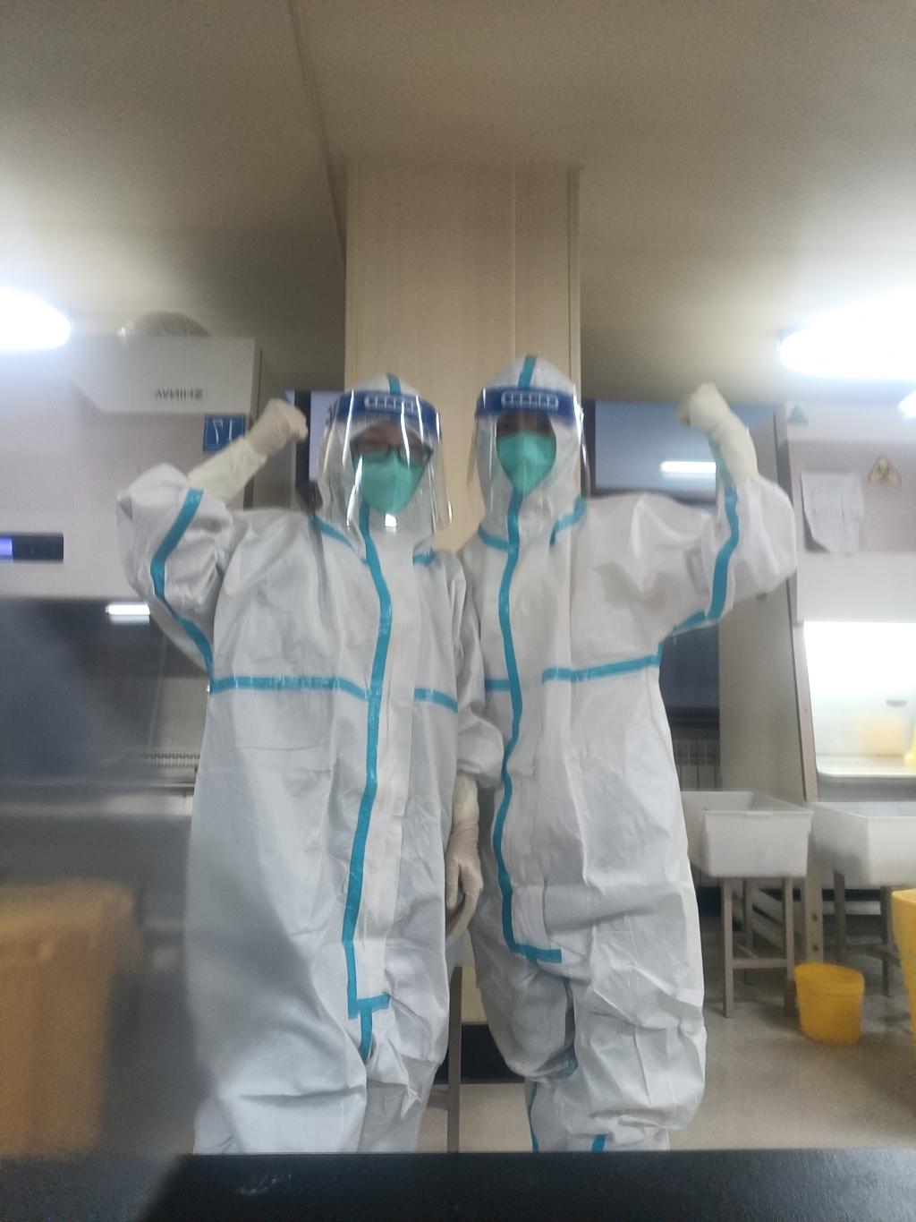罗明洁、杨静两位同志主要参与核酸样本的加样工作。每天早晨9点半前往核酸检测点,完成一天的检测任务回到住处时,常常到深夜11点。由于在核酸加样过程中,长时间的佩戴乳胶手套,她的双手及手臂出现了过敏现象,即使涂抹了抗过敏药物,也只能暂时缓解,白天工作节奏快,感受不到,但一到晚上就奇痒难忍,甚至严重影响睡眠。杨静同志的日常工作除了核酸加样、提取、点样等任务,每天还要用手撕生空板铝膜多达200余个,大拇指和食指异常肿胀酸痛。工作期间,经常熬夜,作息不规律,很多时候不能按时吃饭,导致免疫力下降,口角发炎,皮肤也起了湿疹。就在这种情况下,她们仍然奋战在第一线。