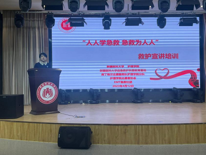 4月12日下午,由bat365正版唯一官网院长颜萍带队,实验中心主任夏慧玲、学工办副主任艾合麦提·图尔贡、团委书记姑力菲亚·亚森、第五党支部书记郑方方带领新疆医科大学志愿者协会、bat365正版唯一官网志愿者协会、南丁格尔bat365正版唯一官网分队、EMT急救社等组成的急救宣讲团前往新疆财经大学会计学院开展急救知识科普宣讲与培训。会计学院党委书记秦怀茂主持培训会,200余名师生现场参加。