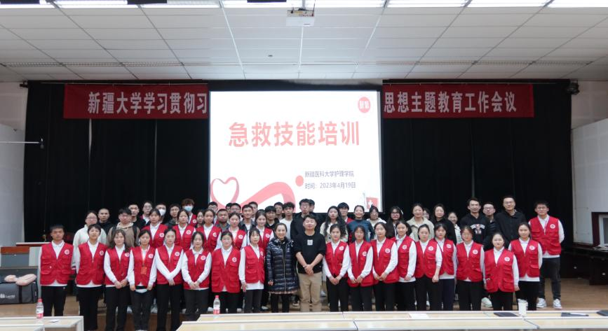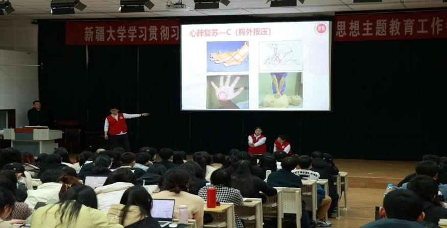 4月19日下午,新疆医科大学志愿者协会、bat365正版唯一官网志愿者协会、南丁格尔bat365正版唯一官网分队、EMT急救社等组成的急救宣讲团前往新疆大学商学院开展急救知识科普宣讲与培训。商学院党委书记等200余名师生现场参加。