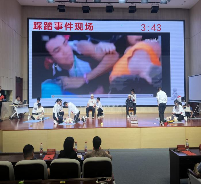 大赛分为理论知识和技能操作两部分,理论知识包括基础急救知识,急救技能细节知识等内容,技能操作部分要求参赛队伍从情景案例中分析伤员伤情,迅速作出分工并开展心肺复苏、头部包扎、腹部包扎等急救技能实操。比赛现场,选手们冷静沉着、思维敏捷、团结协作,一气呵成的完成了急救技能操作,赢得了评委老师的赞许和观众的阵阵掌声。