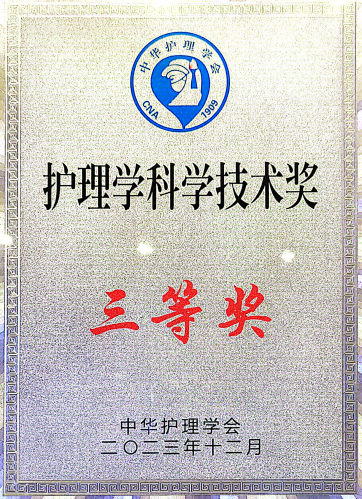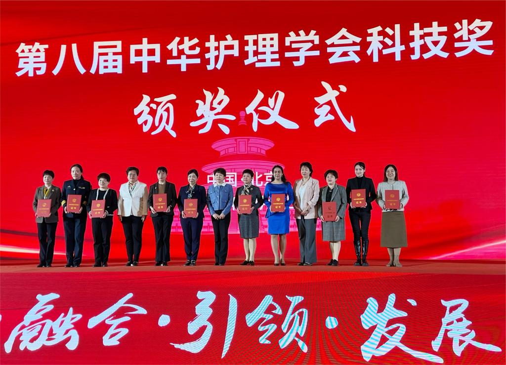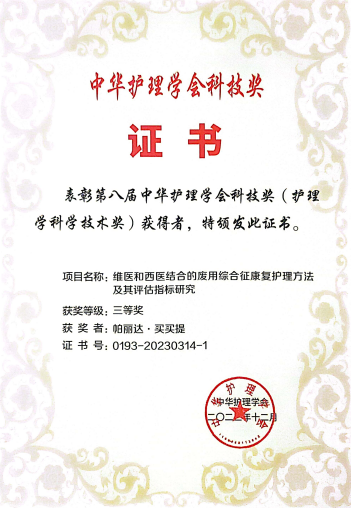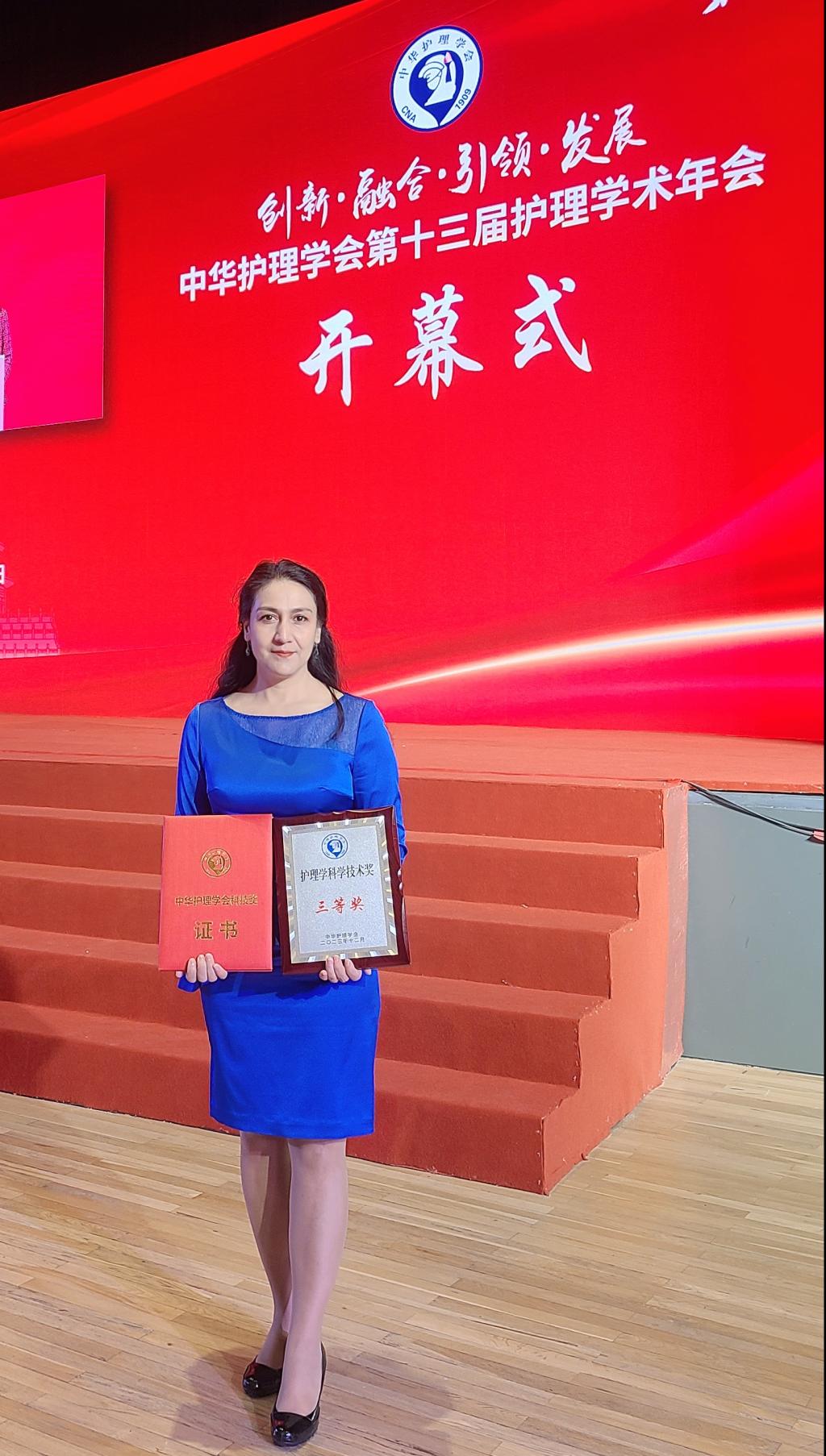 2023年12月1日中华护理学会第十三届护理学术年会在北京召开,开幕式环节进行第八届中华护理学会科技奖颁奖仪式,bat365正版唯一官网帕丽达·买买提教授团队的项目《维医和西医结合的废用综合征康复护理方法及其评估指标研究》荣获科技奖三等奖。