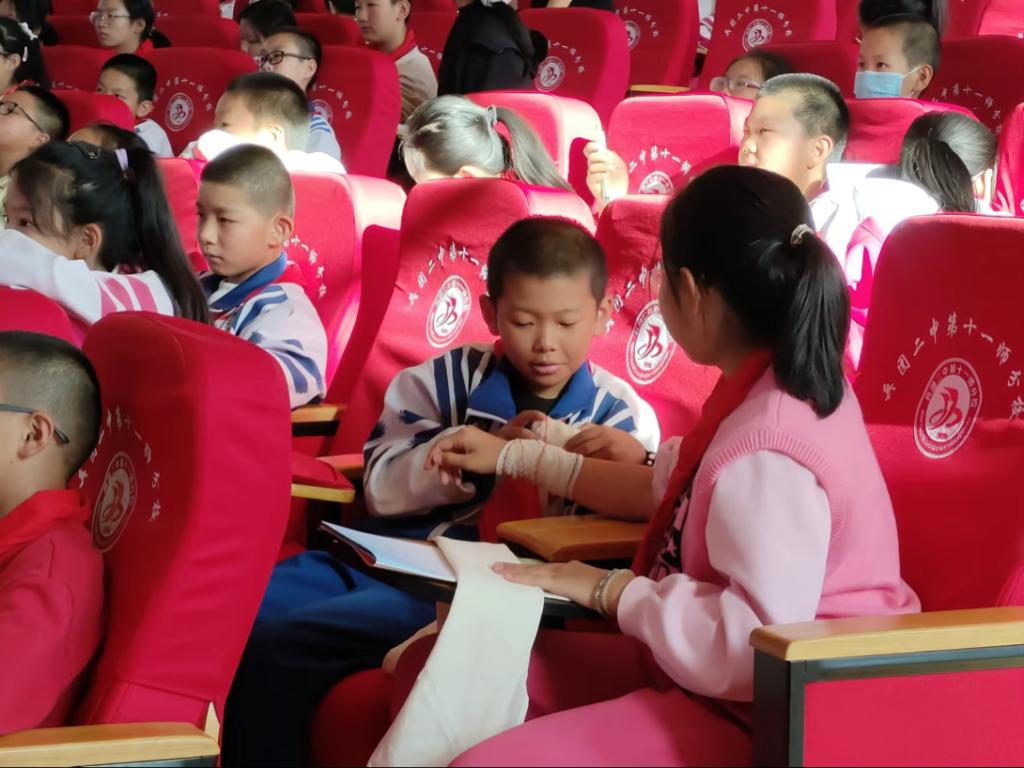 活动主要分为三部分:首先,由兵团二中十一师分校小学部德育处主任进行讲话,对此次“人人学急救、急救为人人”急救宣讲进校园活动进行解释以及对bat365正版唯一官网师生的到来致以诚挚的问候;接着,由新疆医科大学带队老师覃芹丹以“视频+阐述”的方式为大家详细讲解动静脉破裂止血、环形包扎、螺旋包扎、断指残端回返包扎以及海姆立克急救法正确急救技巧;最后,兵团二中十一师五年级的同学们在志愿者的指导下进行实操学习并上台展示。在活动过程中整体气氛融洽和谐,覃芹丹老师积极调动现场氛围,并为回答问题的同学发放奖品,而兵团二中十一师的师生们对急救知识的学习也表现出了极高的兴趣,并在培训过程中掌握了一定的急救知识技能。