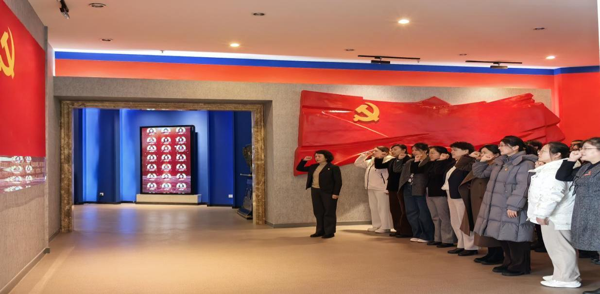 面对党旗,全体人员在朱琳书记领誓下重温入党誓词,铿锵誓言与展墙上“艰苦奋斗、钢铁报国”的标语交相辉映。