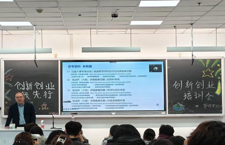 培训中,雷佳宾老师对各类创新创业大赛进行全面解读,针对创业项目的选择、创业团队的组建、创业计划书申报和比赛路演等实操问题给予深入指导,为同学们提供了针对性的建议和指导。