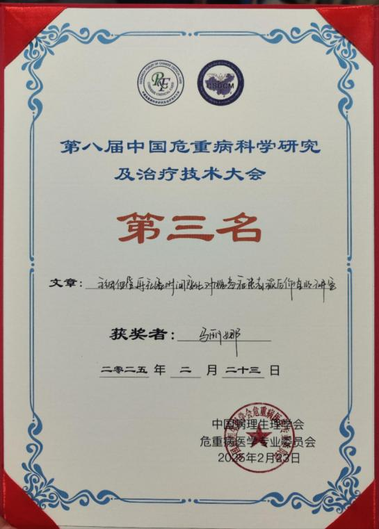 由中国病理生理学会及危重病医学专业委员会主办的"第八届中国危重病医学研究及治疗技术大会"于2025年2月19-23日在深圳成功举办。bat3652023级护理学硕士研究生马丽娜(导师:张莉副教授)受邀参会,其研究成果《毛细血管再充盈时间变化对脓毒症患者预后价值的研究》进行了大会汇报和壁报展示并荣获三等奖。