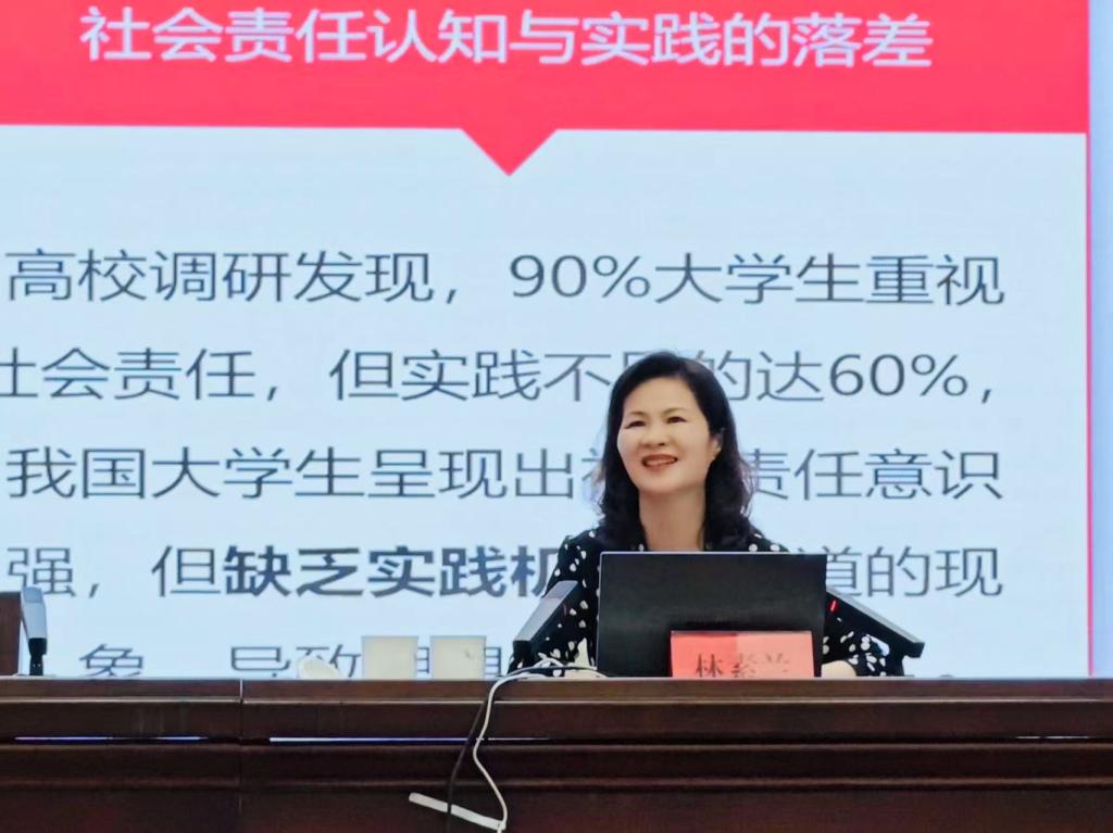 林常委在讲授中以“理想、现实与社会责任”为主题,从理想与现实的碰撞、社会需要什么样的人才、大学生融入社会建设的路径、时代变迁与理想迭代、找到你的历史坐标等角度切入,用生动的语言、鲜活的故事、丰富的案例与师生深入交流。